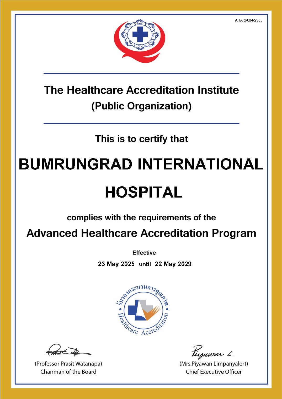 Healthcare Accreditation Institute (Public Organization) In 1999, Bumrungrad Hospital was the First Hospital in Thailand certified as Healthcare Accreditation (HA) from the Healthcare Accreditation Institute (Public Organization) which establishes standards and quality assurance for medical facilities to ensure that people receives standard quality of care. In 2016, Bumrungrad Hospital has further developed quality of care to achieve vision and strive to the excellence and being certified as Advanced Hospital Accreditation